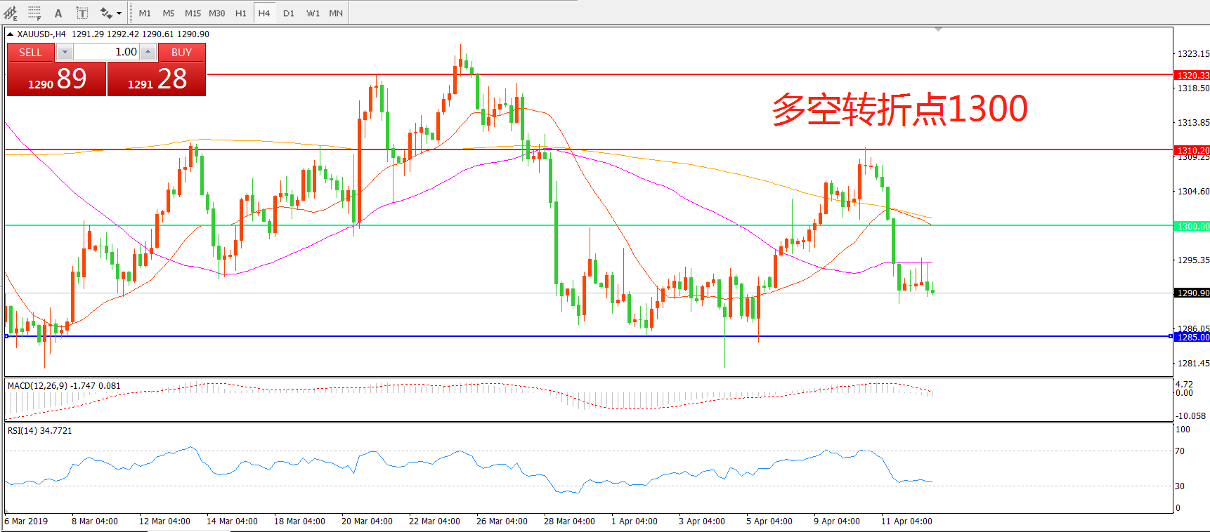 交易策略:在1300.00之下看跌,目标1285.00   1270.00