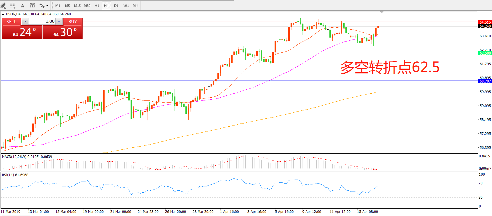 风险意愿改善继续为原油等风险资产提供支撑,同时委内瑞拉、伊朗及利比亚的原油供应面临继续下滑的风险,这令油价涨势有望延续。美国WTI原油周二(4月16日)收涨0.85美金,报64.30美元/桶。美国石油学会(API)周二(4月16日)公布报告,API原油库存意外大降310万桶,汽油和库欣库存也双双减少。晚间22:30EIA库存数据公布,重点关注,目前市场预期增加100.9万桶,如公布数据出现降低,油价有望延续上行。