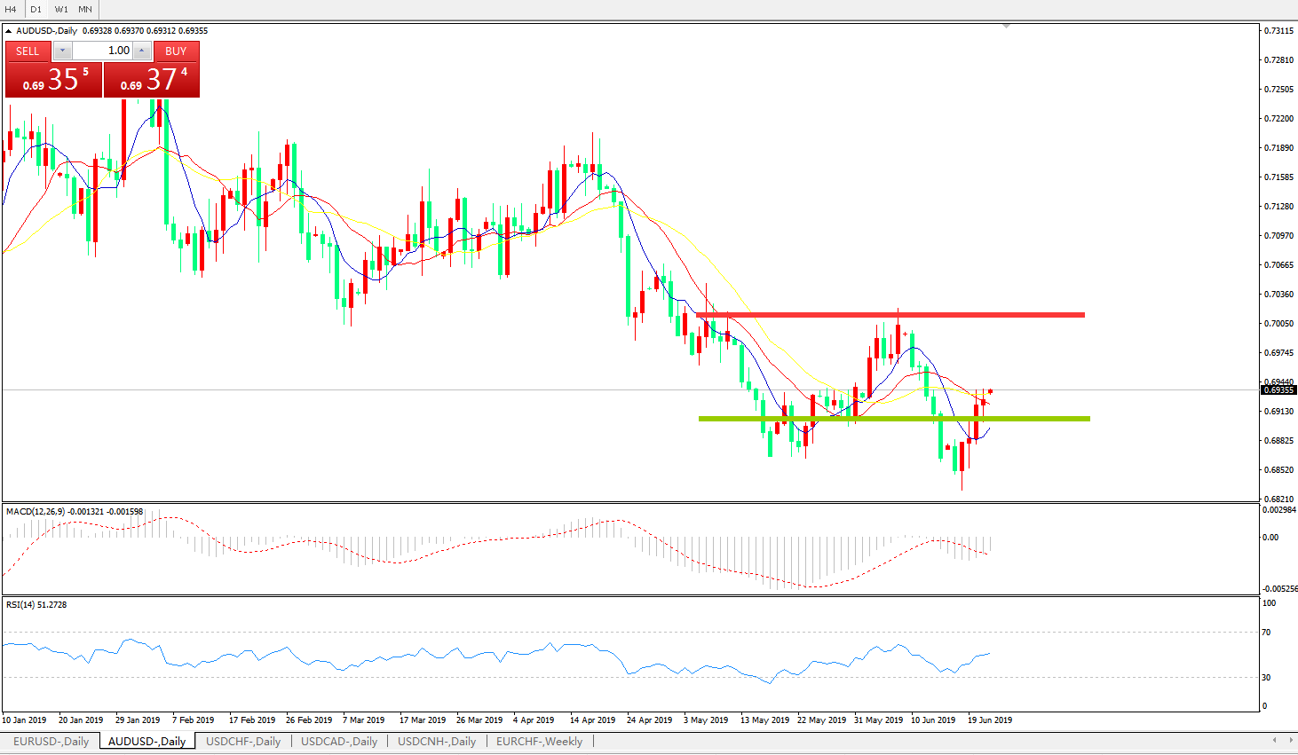 技术面简析:日图短期均线开始拐头上攻,汇价延续反弹迹象但幅度有限,MACD在0轴下方运行但动能柱持续缩量,RSI逐步反弹走高,汇价在贸易战及美联储货币政策影响下反弹,但中期依旧考虑逢高做空。
