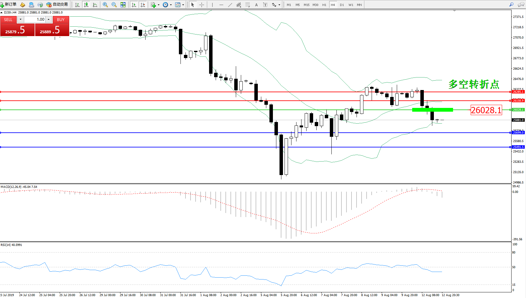 道琼斯指数812日(周一)收盘下跌391.00点,跌幅1.49%,报25896.44点。倒挂的美债收益率在强化美国经济料陷入衰退的预期,也强化了美联储进一步宽松的预期,施压道指,摩根士丹利表示,将2019年底美国10年期国债收益率预期下调至1.60%,市场将预期美联储在2020年降息3-4次。贸易紧张局势的发展影响大于预期,将下调美国第四季度的经济增长预期20个基点到1.8%
