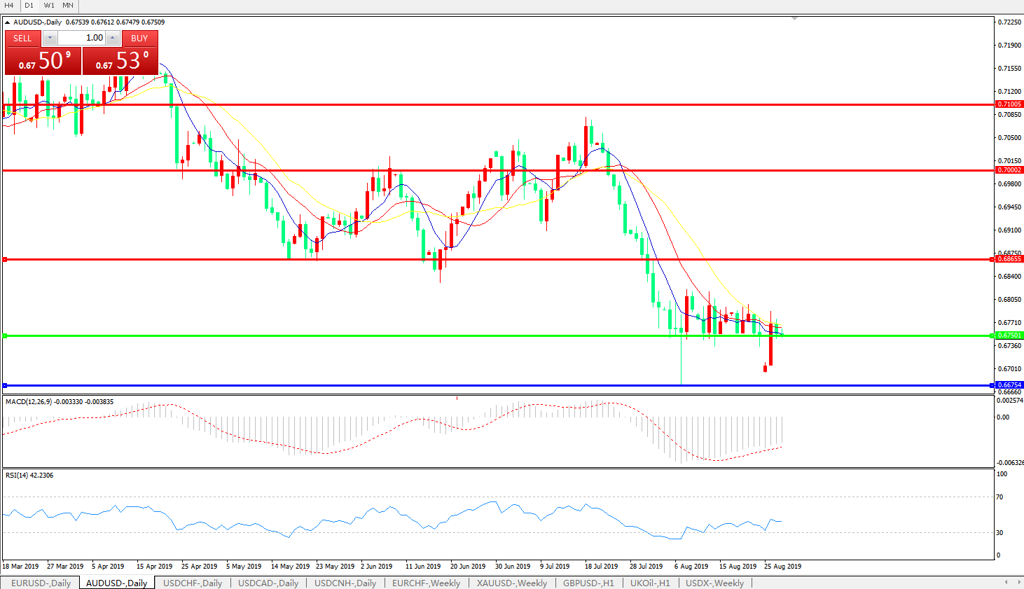 澳元兑美元在周二亚洲时段再度承压下跌,最低触及0.6747,回吐了周一的反弹涨幅,原因在于全球贸易风波仍在持续发酵,令依赖出口的澳洲雪上加霜。日内亚太地区新兴市场货币的集体承压也拖累了欧元的走势;在此状况下,澳洲联储助理主席德贝尔日内也进一步释放了鸽派言辞,称在全球经济下行风险严峻的背景下,澳洲联储已经做好了“随时采取进一步行动”的准备,这让更多投资者押注澳洲联储下周会议可能再度降息;而在低位横盘了近一个月之后,澳元兑美元的中长期走势趋势指标仍指向下行,因此下周会议可能是个变盘节点,在眼下贸易恐慌依旧而美元指数却仍相对坚挺的背景下,提前押注看空的交易会在本周起就对澳元进一步施压。