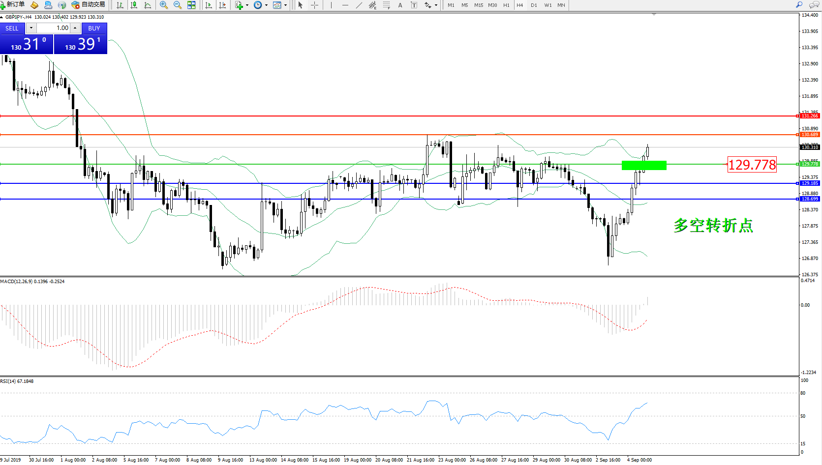 备选策略:129.778上方看涨,目标130.689、131.266