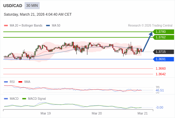 技术点评: RSI技术指标小于中性区域50。 MACD技术指标处在其信号线之上看空。 混合配置。 此外,价位低于其20天及50天移动平均线 ( 分别位于1.3718 和1.3726 )。