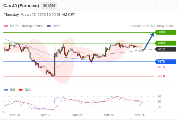 法国CAC指数期货 (Euronext) (J6) 当日内: 期待7880。