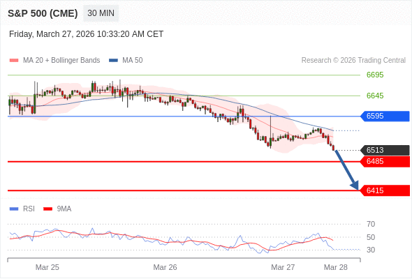 美国标普500指数期货 (M6) 当日内: 下跌趋势。