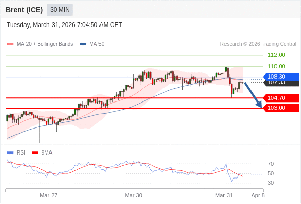 交易策略: 在 108.30 之下,看跌,目标价位为 104.70 ,然后为 103.00 。