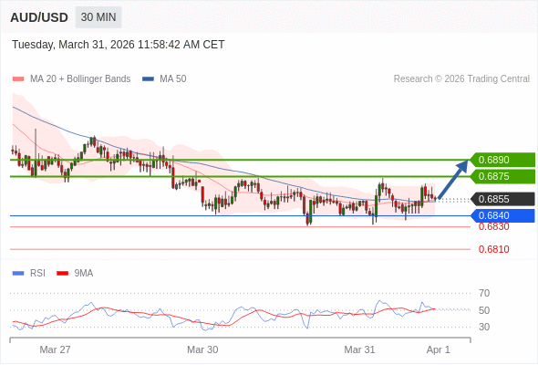 在 0.6840 之上,看涨,目标价位为 0.6875 ,然后为 0.6890 。