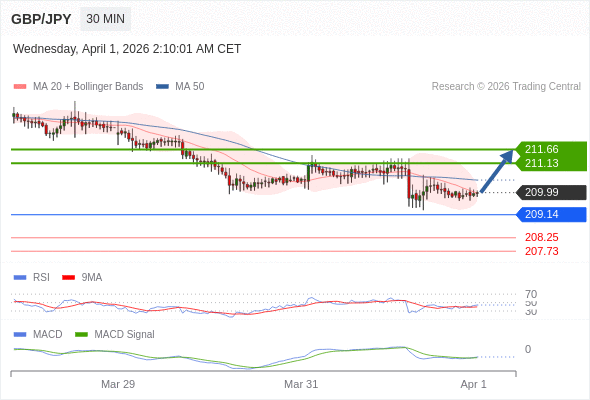 备选策略: 如跌破 209.14 ,GBP/JPY 目标方向定在 208.25 和 207.73 。