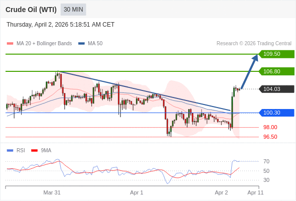 交易策略: 在 100.30 之上,看涨,目标价位为 106.80 ,然后为 109.50 。