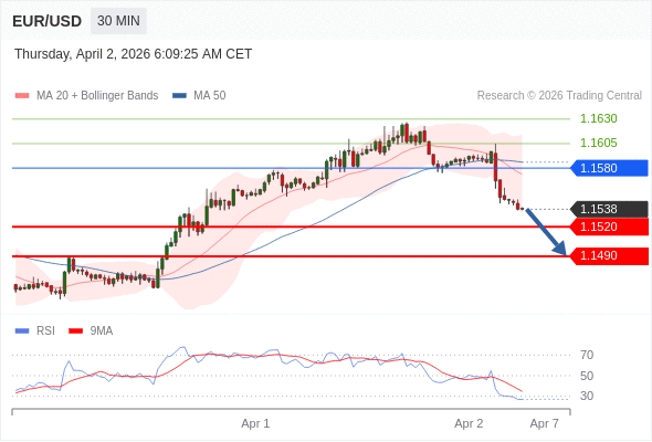 交易策略: 在 1.1580 之下,看跌,目标价位为 1.1520 ,然后为 1.1490 。
