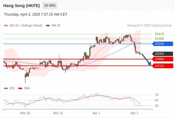 交易策略: 在 25240 之下,看跌,目标价位为 24880 ,然后为 24720 。