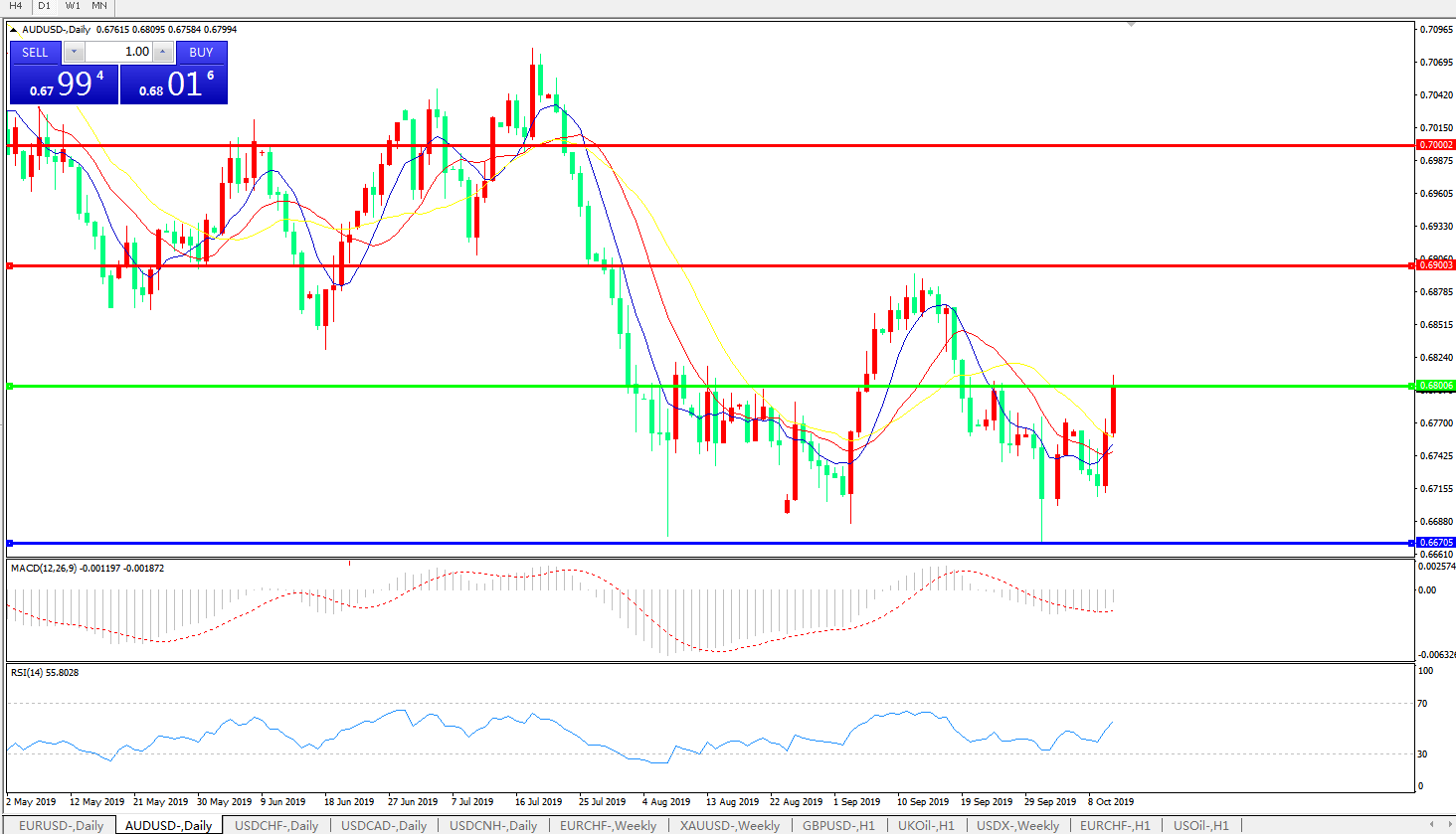 澳元兑美元在周五亚洲时段延续涨势,日内升至0.6787这一自9月25日以来的两周半新高,因隔夜以来全球消息面的人状况全面向好。一方面,投资者对全球贸易环境在此前取得突破性进展寄予厚望,另一方面,英国脱欧协议前景有望峰回路转,则进一步提振了市场信心;作为对贸易相关情绪高度敏感的商品系货币,澳元近期以来即随着贸易情绪的反复而持续波动,并在确信的乐观消息下终于突破前期盘整区间。市场因而正在等待进一步后继消息的出炉,在周末来临前保持谨慎看涨态度;技术上看,澳元兑美元短线面临0.6800-10的趋势阻力位,升破之后将上看9月份的高点0.6895,从而完成中期双底的构筑。但如果消息面再度急转直下,那么周二和上周五的阶段高点0.6775将是首要支撑,失守后将瞎看10日均线0.6741的支撑,之后若进一步跌破0.67关口,则表明反弹的夭折和跌势的重启、