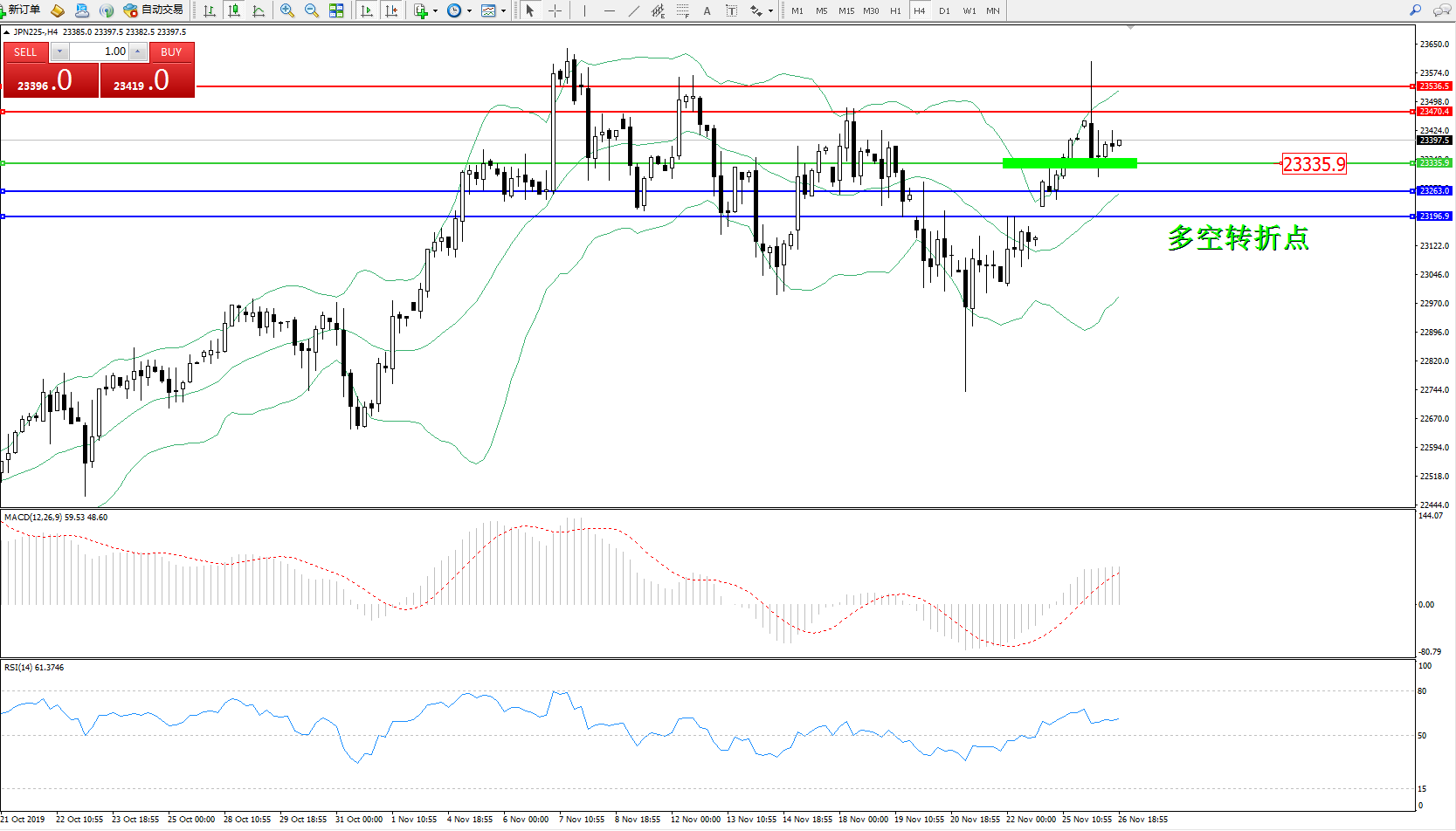日经225指数1126日(周二)收盘上涨82.19点,涨幅0.35%,报23375.00点。日本央行料会一直维持现行政策不变。此前预计日本央行会在下月进一步加大政策宽松力度。日本政府出台规模大于预期的一揽子财政刺激计划的可能是改变预期的最重要原因,而一揽子财政刺激计划的规模有可能超过6万亿日元(550亿美元)。若贸易谈判取得进展,日本央行的维持现状立场将得到进一步的巩固。然而,日元快速升值和经济疲软带来的通胀上行势头减缓会促使日本央行考虑祭出进一步的刺激措施。