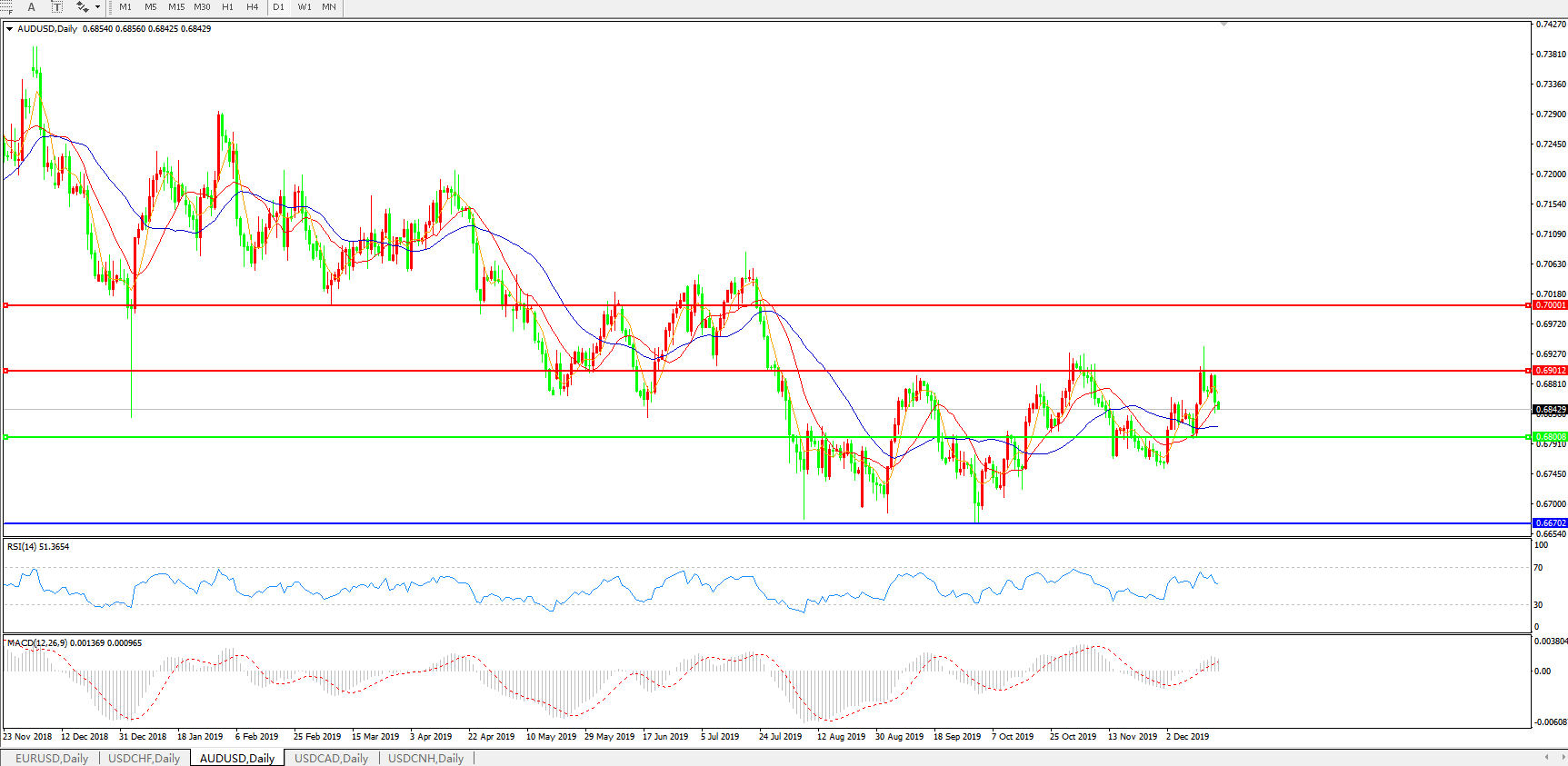 技术面简析:日图均线整体呈多头排列,汇价近日承压持续回落中,MACD拐头上行穿越0轴但量能后继乏力,RSI持续走低,短线关注0.68关口支撑是否有效,预计汇价大概率将进一步走低。