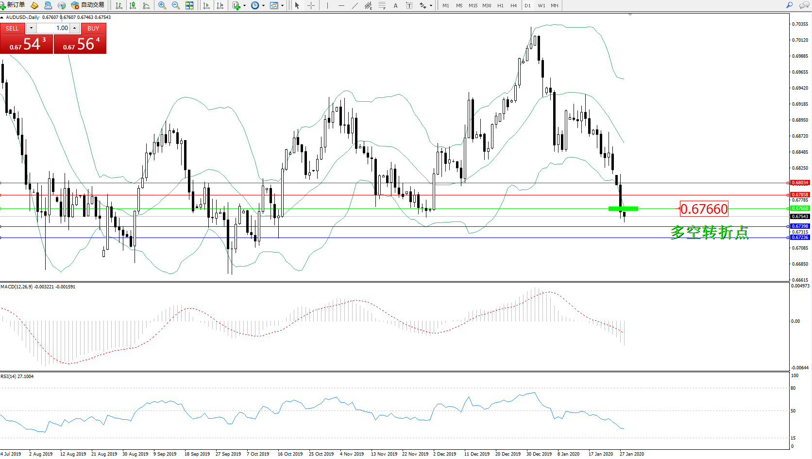 交易策略:0.67660下方看跌,目标0.67398、0.67236
