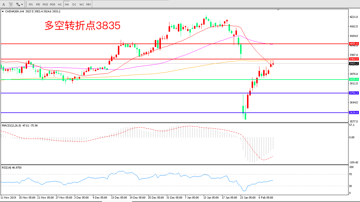 4小时图看,沪深300阳线连续拉升,整体表现强势,3960成为短期阻力,均线系统走平,MACD绿柱缩短,RSI指标走平,日内延续上行概率较大。