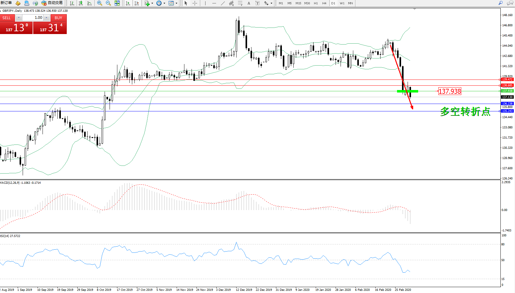 易策略:137.938下方看跌,目标136.238135.243