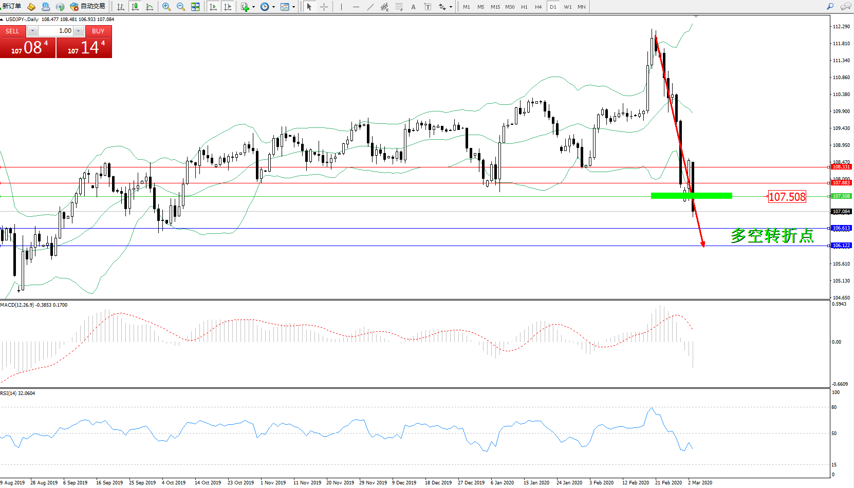 交易策略:107.508下方看跌,目标106.613106.122