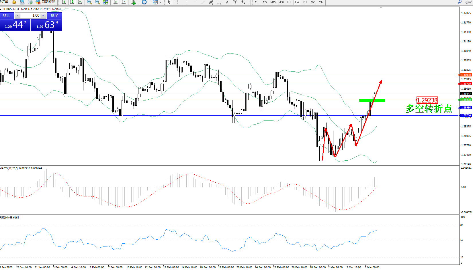 交易策略:1.29238上方看涨,目标1.29760、1.30050