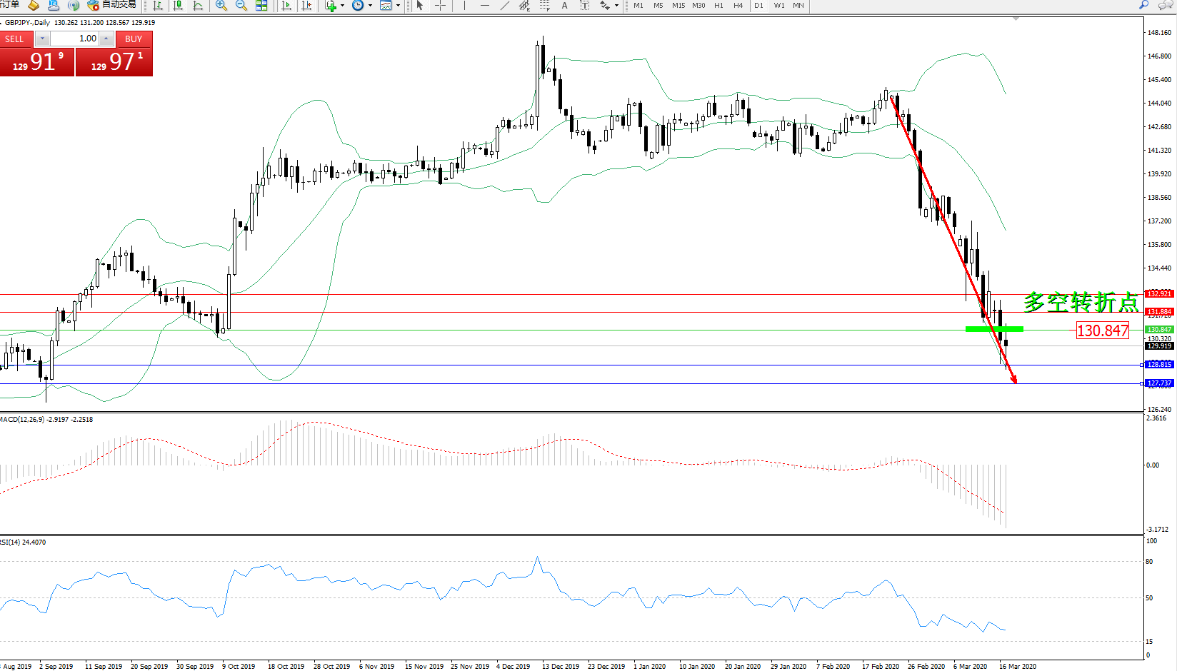 交易策略:130.847下方看跌,目标128.815、127.737