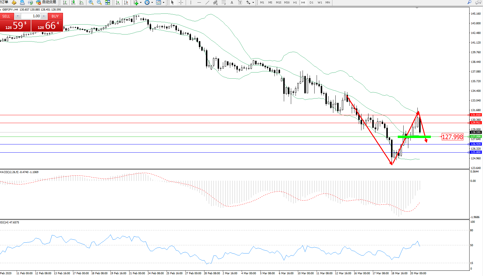 备选策略:127.998下方看跌,目标126.939125.800