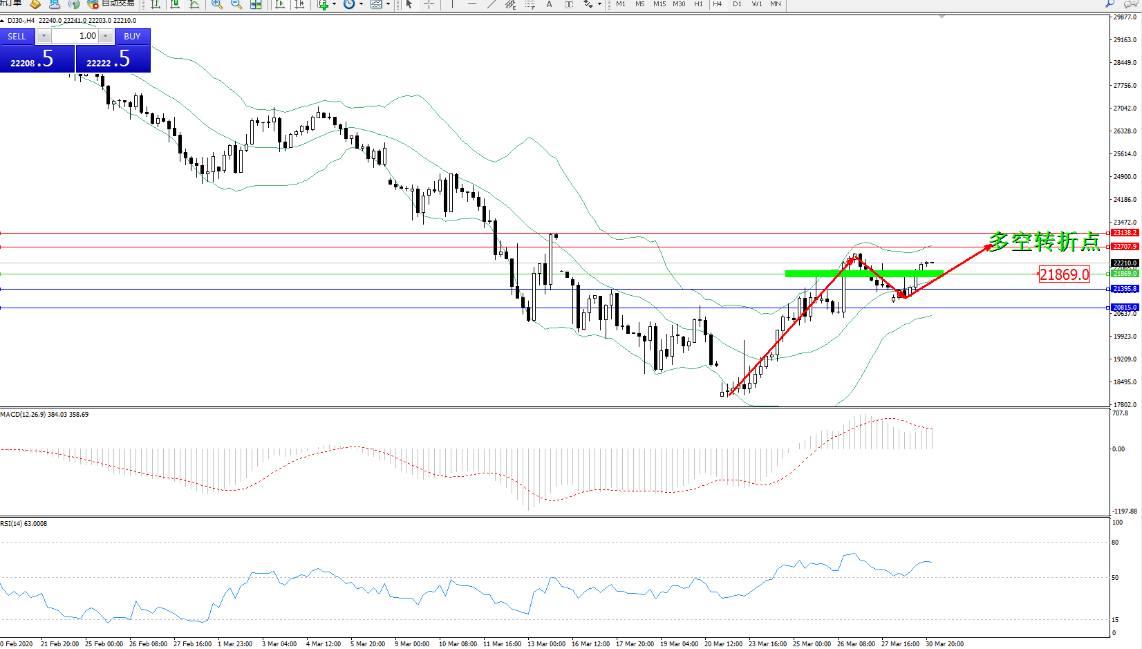 道琼斯指数3月30日(周一)收盘上涨690.70点,涨幅3.19%,报22327.48点。周一美股全线收高,投资者继续追踪冠状病毒的传播状况及其经济影响。市场仍在消化美国2万亿美元刺激方案,美联储前期推行了降息至零、无限QE等前所未有的宽松措施,但未来操作空间已经不大。现在轮到财政刺激政策上阵,目的仍是避免疫情对经济造成更大的伤害。穆迪下调总值6.6万亿美元的美国非金融企业债务评级展望,由稳定降为负面。穆迪表示,下调评级展望是要反映在新冠肺炎疫情冲击下,美国经济陷入衰退,企业整体遭到打击,以致违约风险上升的因素。