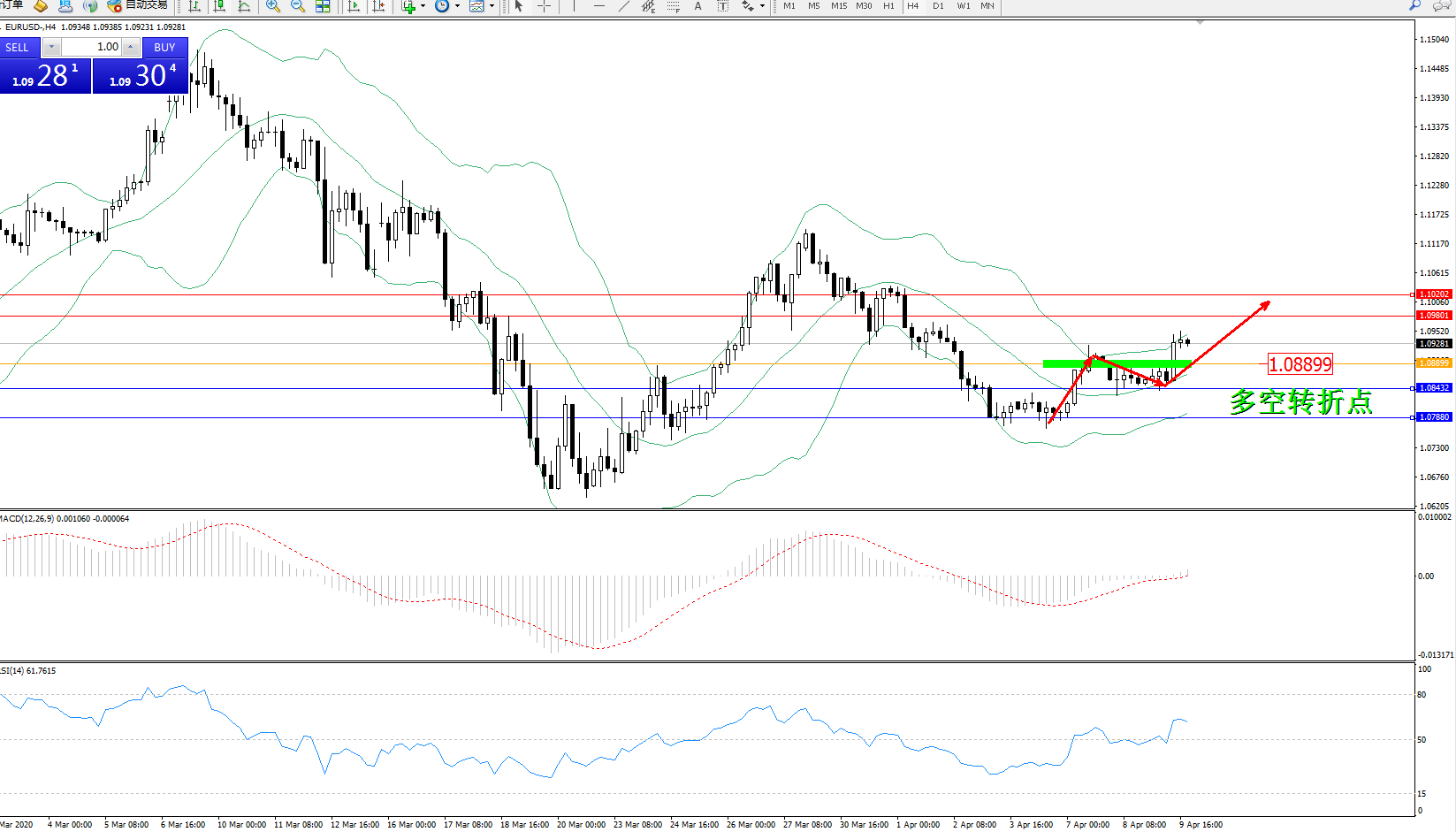 交易策略:1.08899上方看涨,目标1.098011.10202