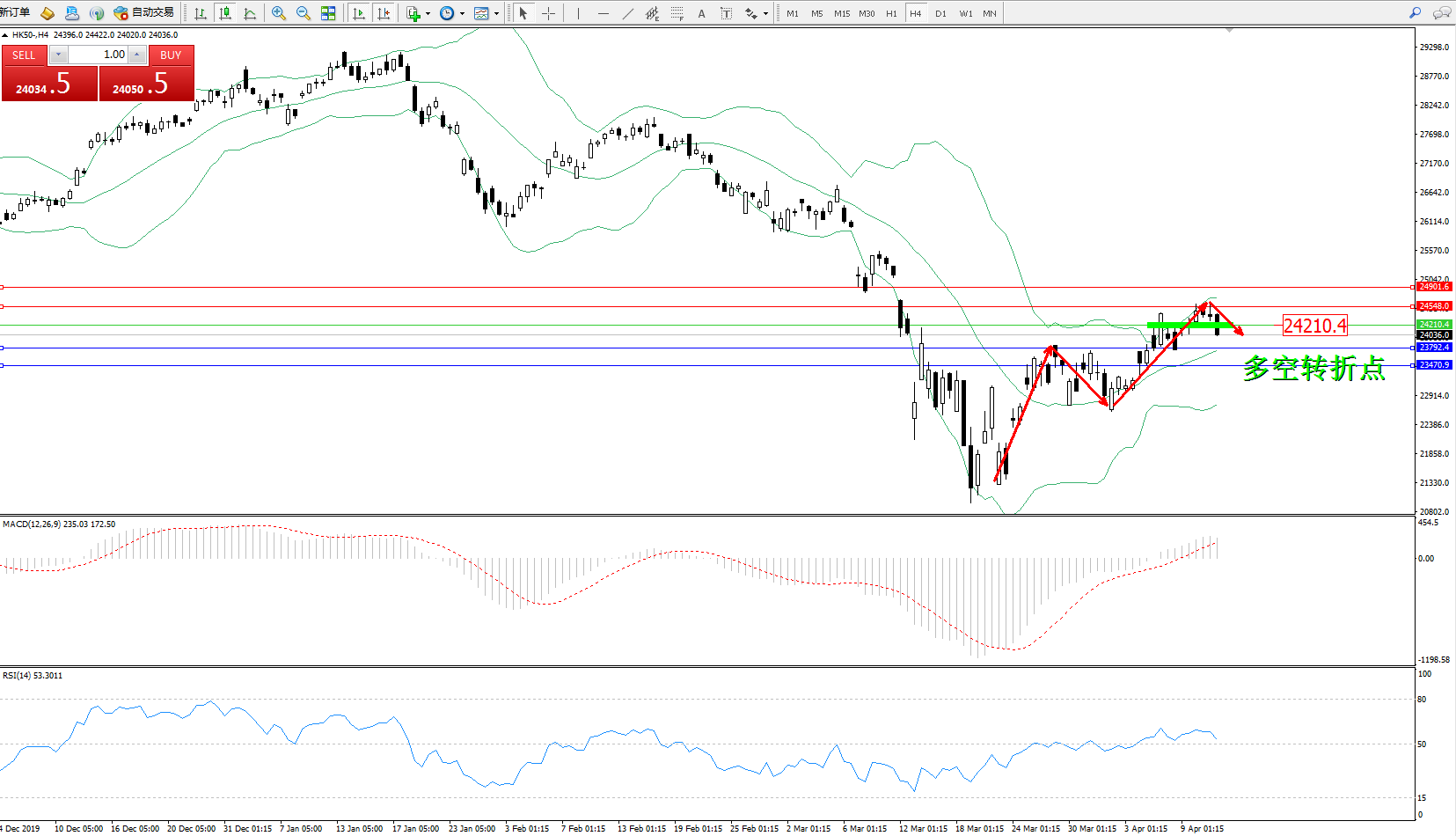 恒指HK50 ——4小时K线图显示: