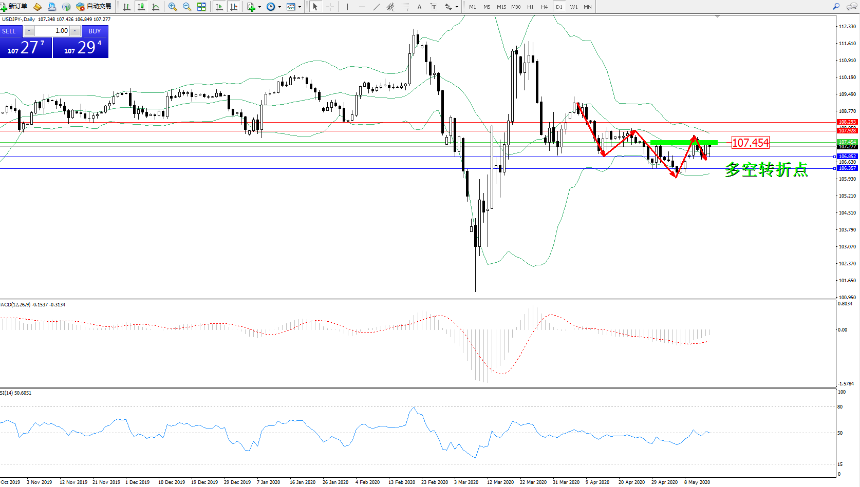 交易策略:107.454下方看跌,目标106.852106.357