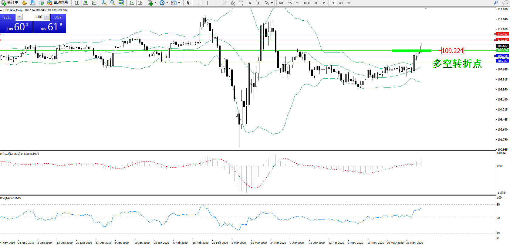 美元兑日元上涨0.4%109.59;稍早触及326日以来高点109.85。美国劳工部的就业报告显示,5月份失业率从4月触及的二战后最高水平14.7%降至13.3%。此前的调查显示,消费者信心、制造业和服务业都在企稳。3月中为减缓疫情蔓延而关闭的企业现已重新开业,经济状况明显改善。美国的就业数据好于预期,市场接下来的反应是对美国经济增长好转的预期,以及收益率曲线趋陡,资金继续流出避险资产,全球股市继续走高,而美债收益率则继续攀升,反映市场预期已经转为乐观情绪。