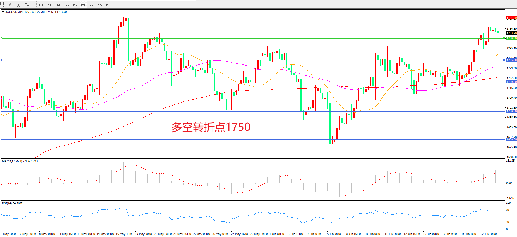 交易策略:在1750.00之上看涨,目标1764.00 1780.00