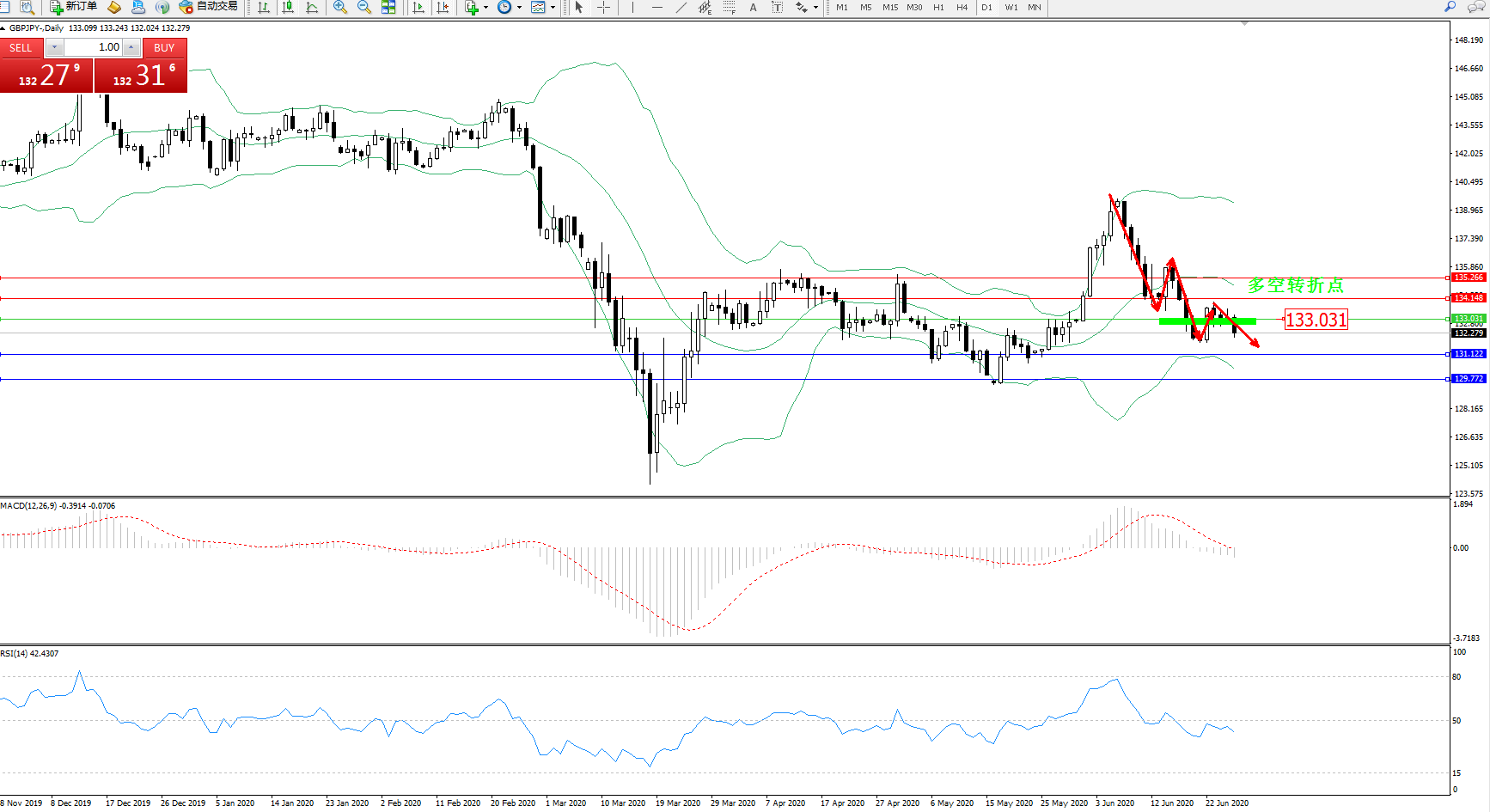 交易策略:133.031下方看跌,目标131.122、129.772