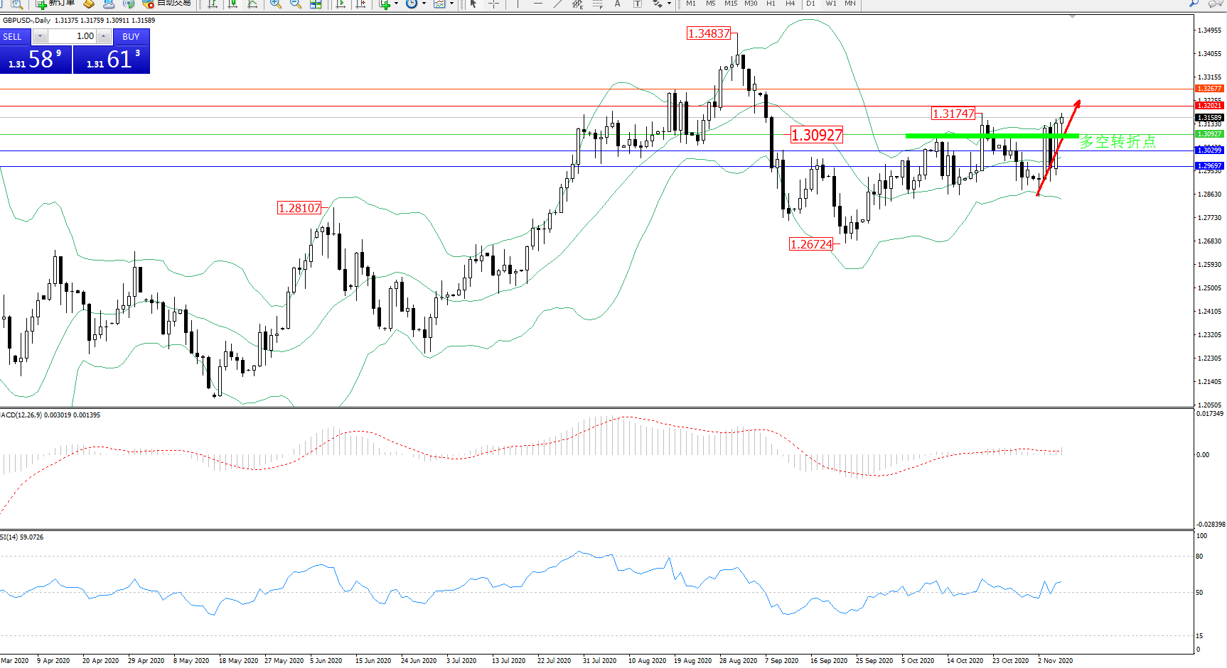 交易策略:1.30927上方看涨,目标1.32021、1.32677