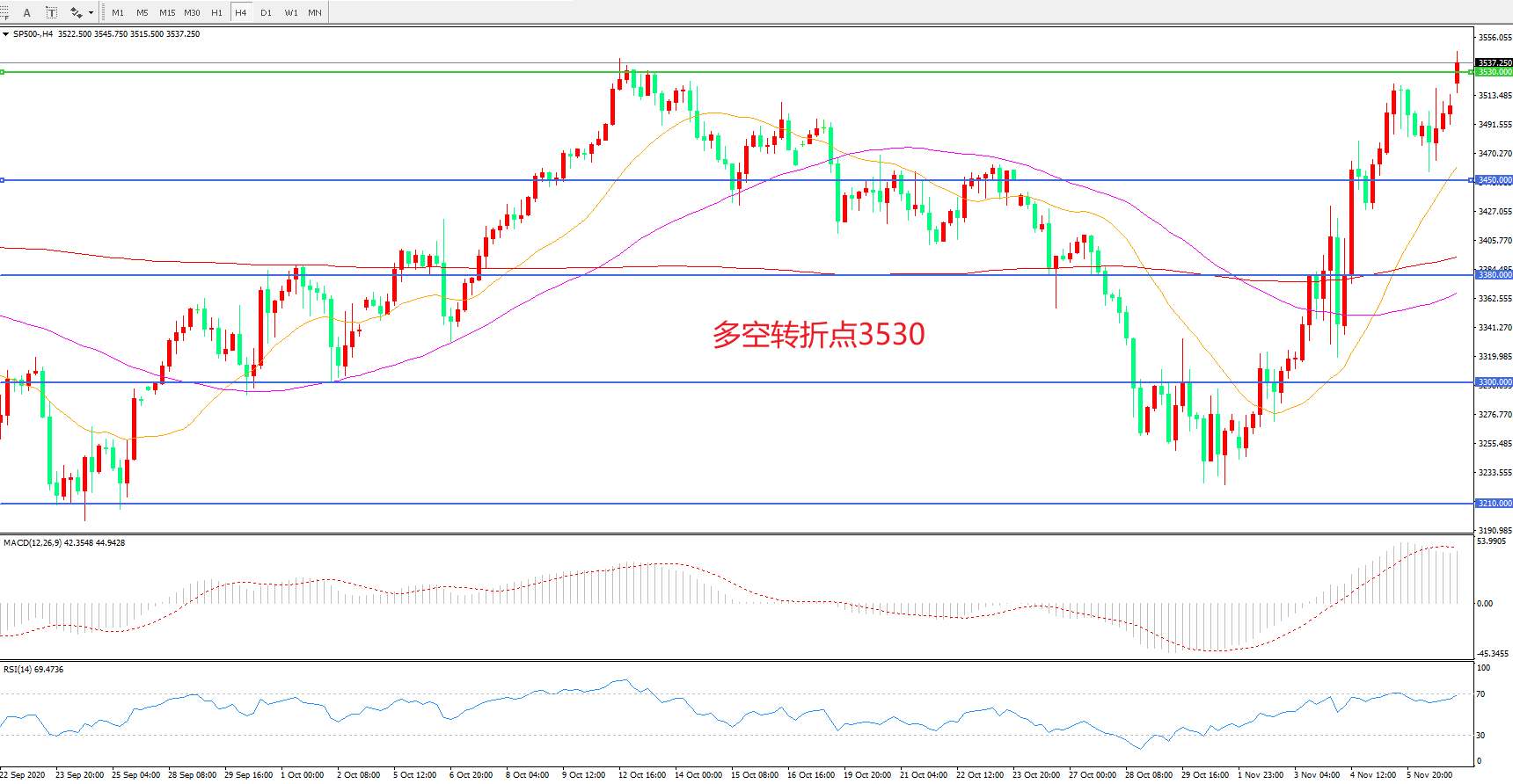 4小时图看,标普500阳线连续拉升,整体表现有所回暖,3450成为多空分水岭,均线系统逐渐走平,MACD红柱增加,RSI指标走平,日内震荡上行概率较大。