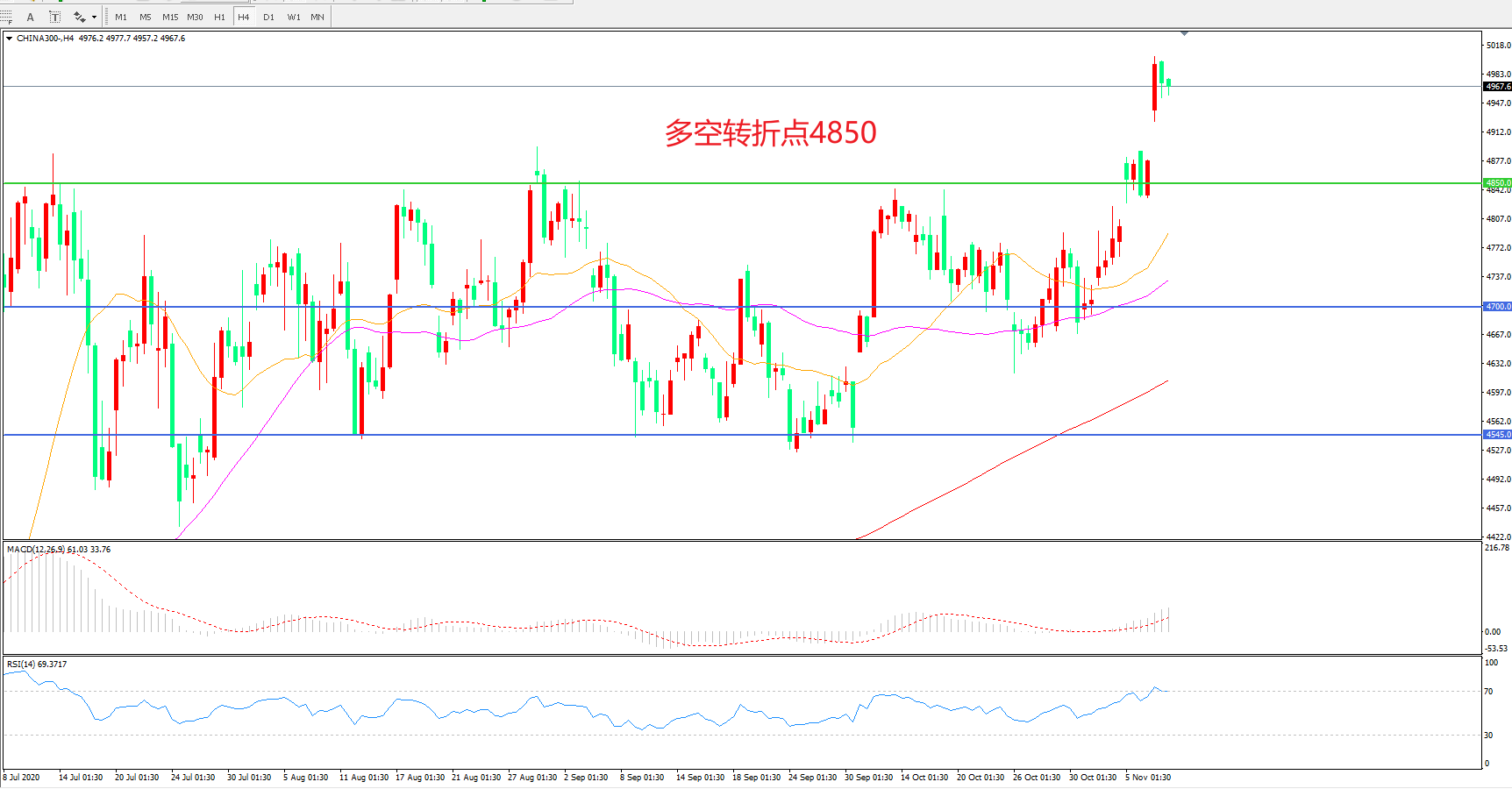 4小时图看,沪深300高开高走,短期走势表现较强,均线系统拐头向上,MACD红柱增加,RSI指标向上,日内延续上行概率较大。