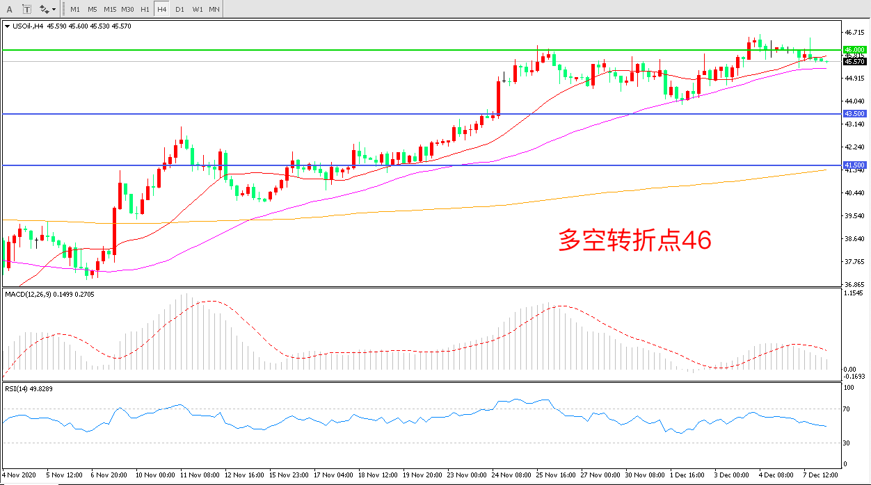 4小时图看,油价延续高位震荡,46美元成为多空分水岭55周期均线成为短期支撑MACD红柱减少,RSI指标走平,日内延续震荡概率较大。