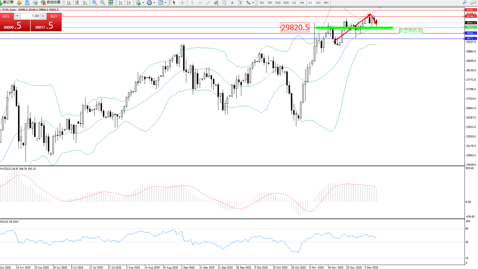 交易策略:29820上方看涨,目标30246、30493