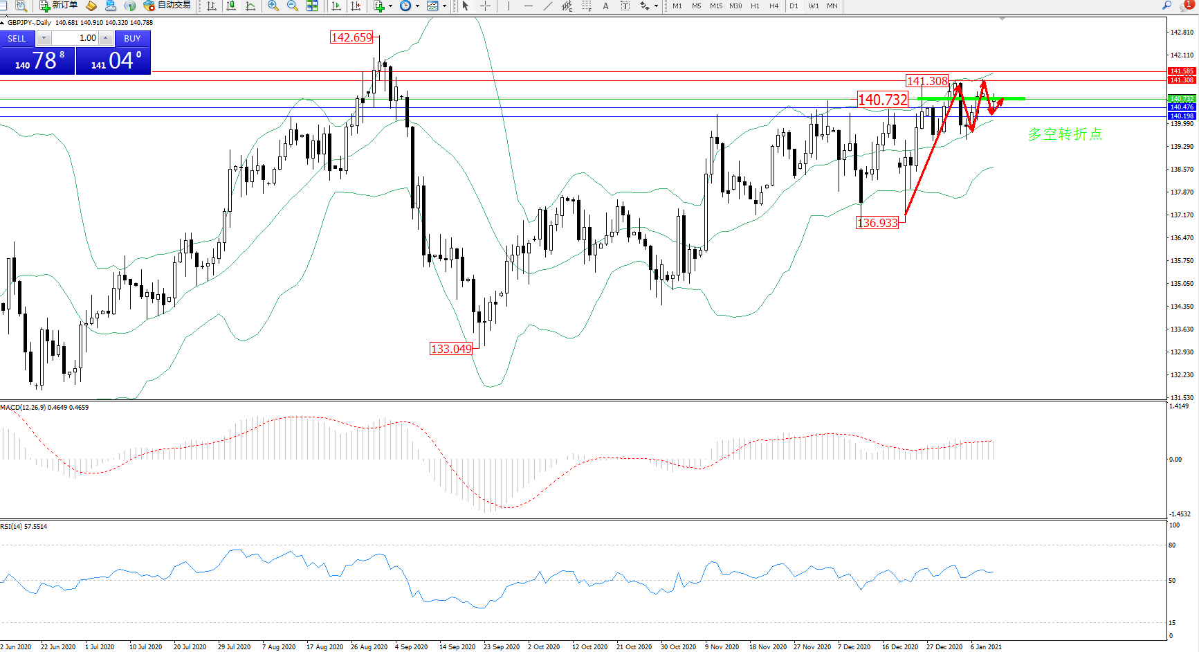 交易策略:140.732上方看涨,目标141.308、141.585