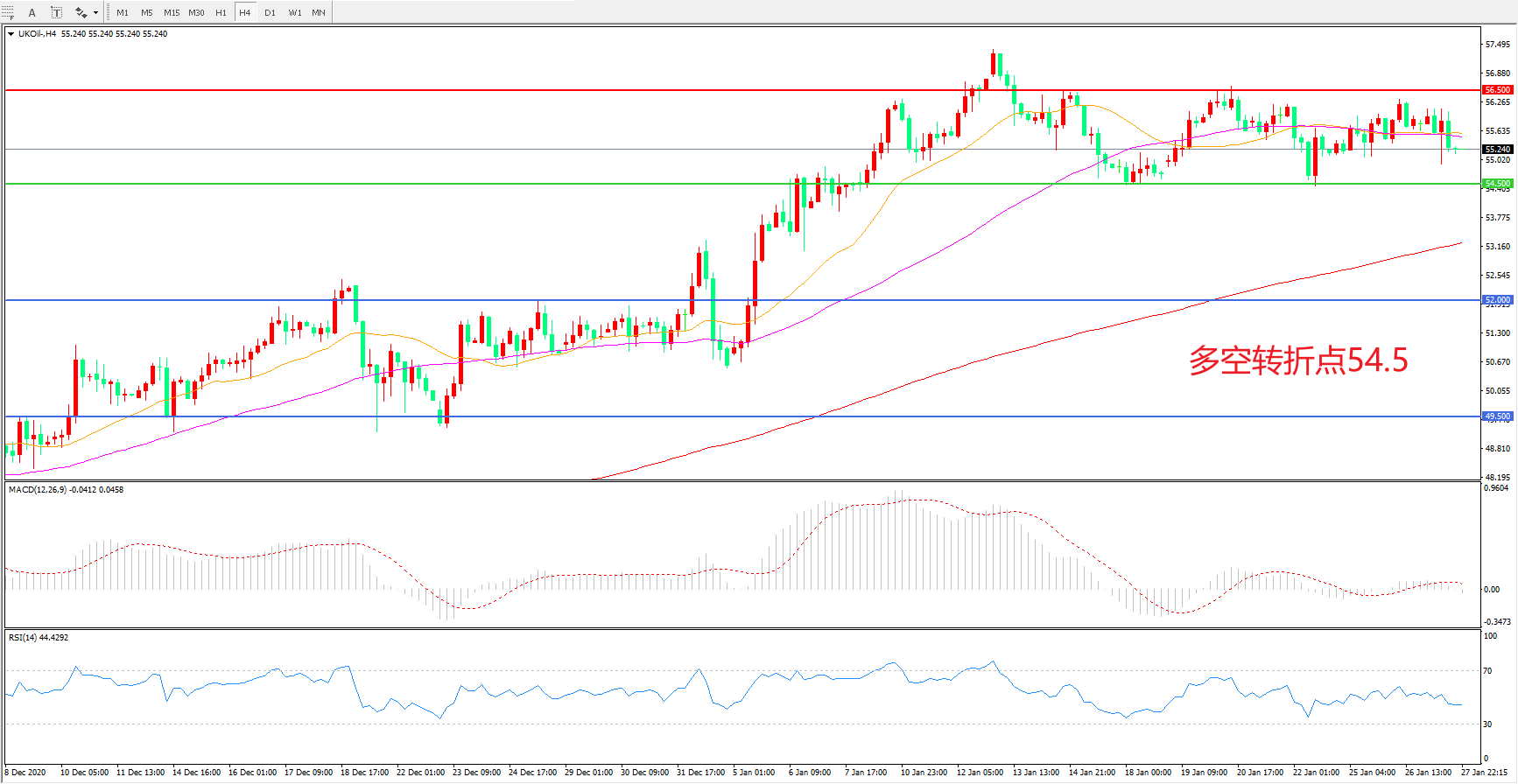 交易策略: 在54.50之上看涨,目标56.50 60.00