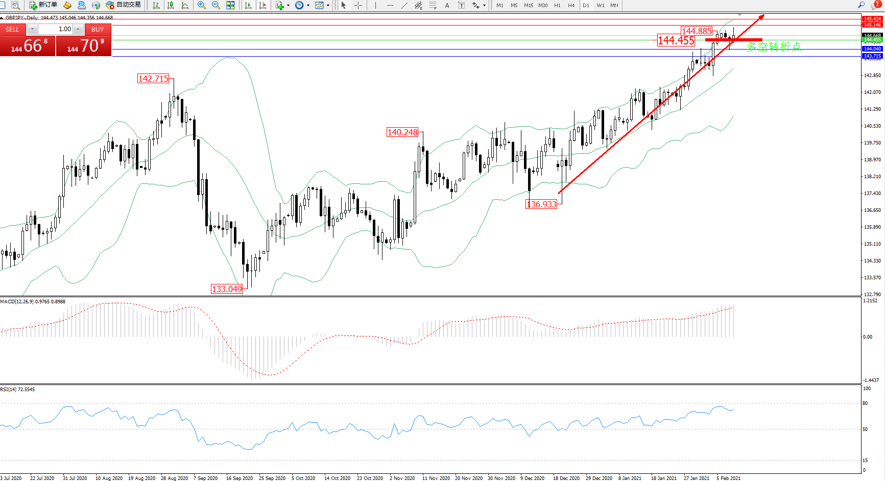 技术点评:多头动力延续布林带指标通道中上轨区间持续震荡上扬,高位抵达144.885附近节点后维持短暂整理有下行迹象,布林带指标呈上行走势后有收口迹象,MACD指标处于多头区域平缓向上移动态势良好,RSI指标处于多头区域维持整理上行后有平缓下行迹象;’