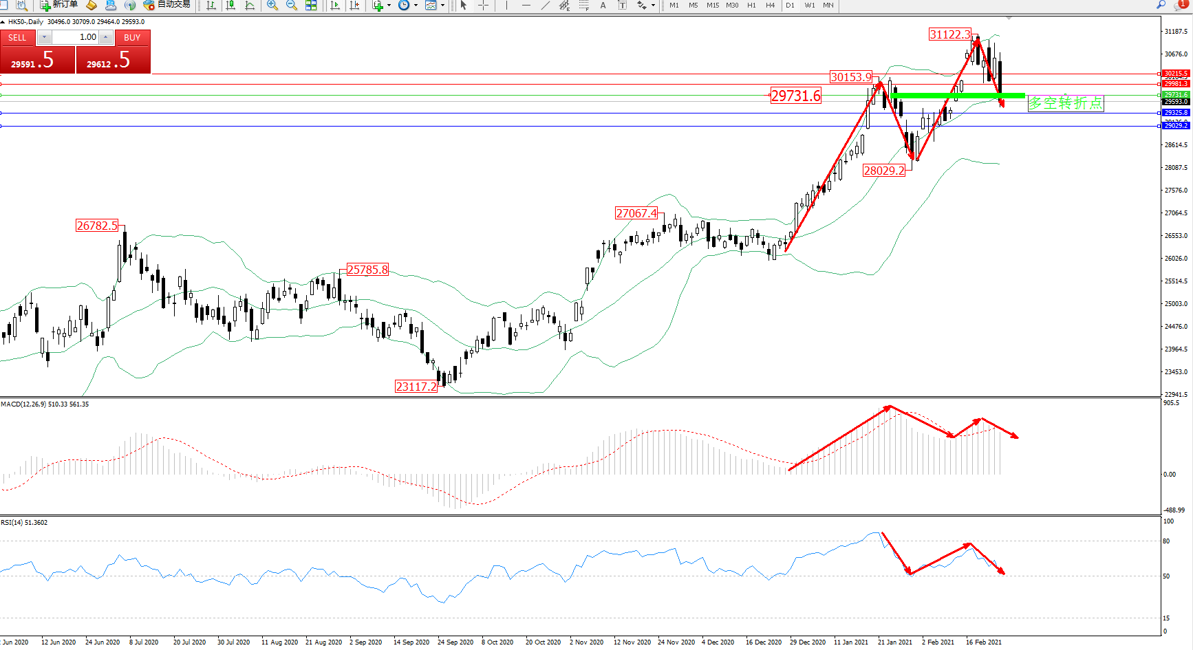 技术点评:多头动力延续布林带指标通道中上轨区间持续震荡上扬态势良好,高位抵达31122位置节点后遇阻出现震荡回撤下行,抵达布林带指标中轨附近节点后短暂支撑,空头动力有进一步向下移动态势,布林带指标呈张口走势后开始有收口迹象,MACD指标处于处于多头区域高位持续整理有缓慢下移迹象,RSI指标处于多头区域高位震荡回撤至50均衡线上側附近弱势下移中;