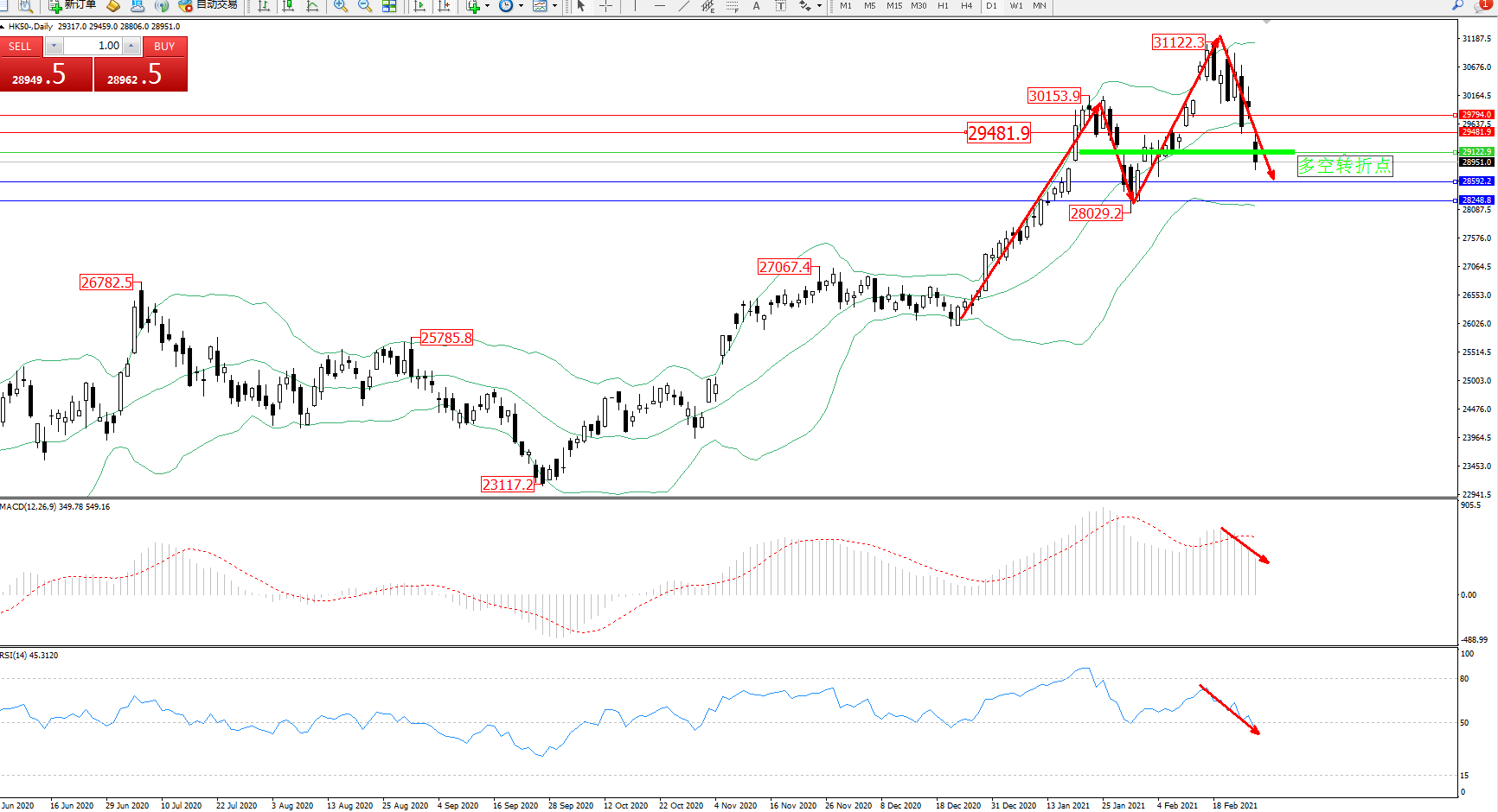 交易策略:29122下方看跌,目标28592、28248