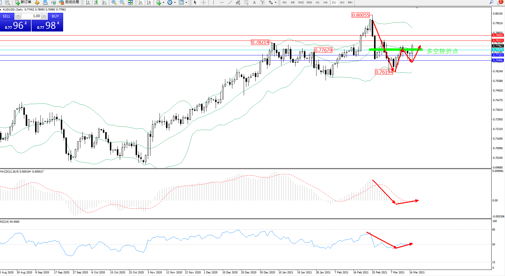 备选策略:0.77679下方看跌,目标0.77323、0.76966
