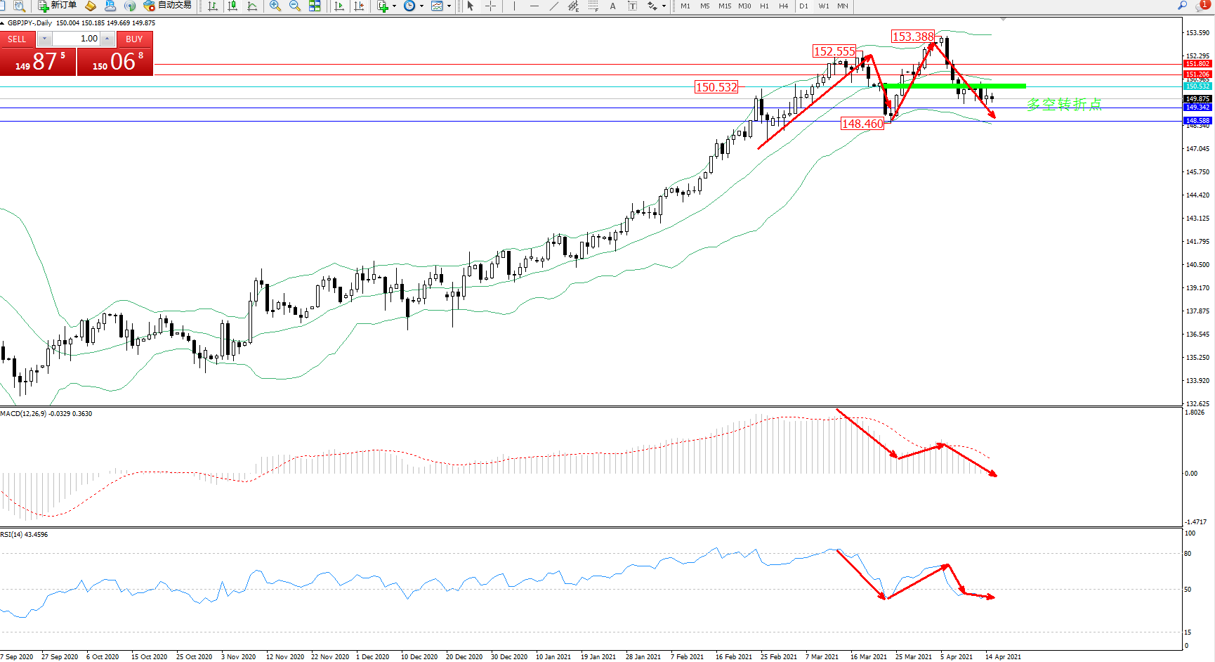 交易策略:150.532下方看跌,目标149.342、148.588