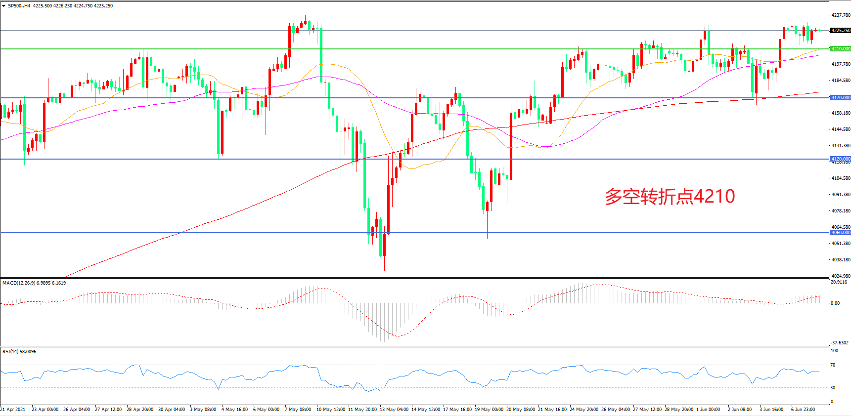 周一(6月7日),美国经济在夏季重新开放的情况下快速恢复,标普500受到提振,小幅上行后收报4225.75点,距离历史新高仅一步之遥。大型科技股中仅亚马逊和奈飞跌,Facebook和谷歌创出新高,本周重点关注5月美国CPI数据,如果通胀数据再度“爆表”,可能会引起美股的大幅回调。