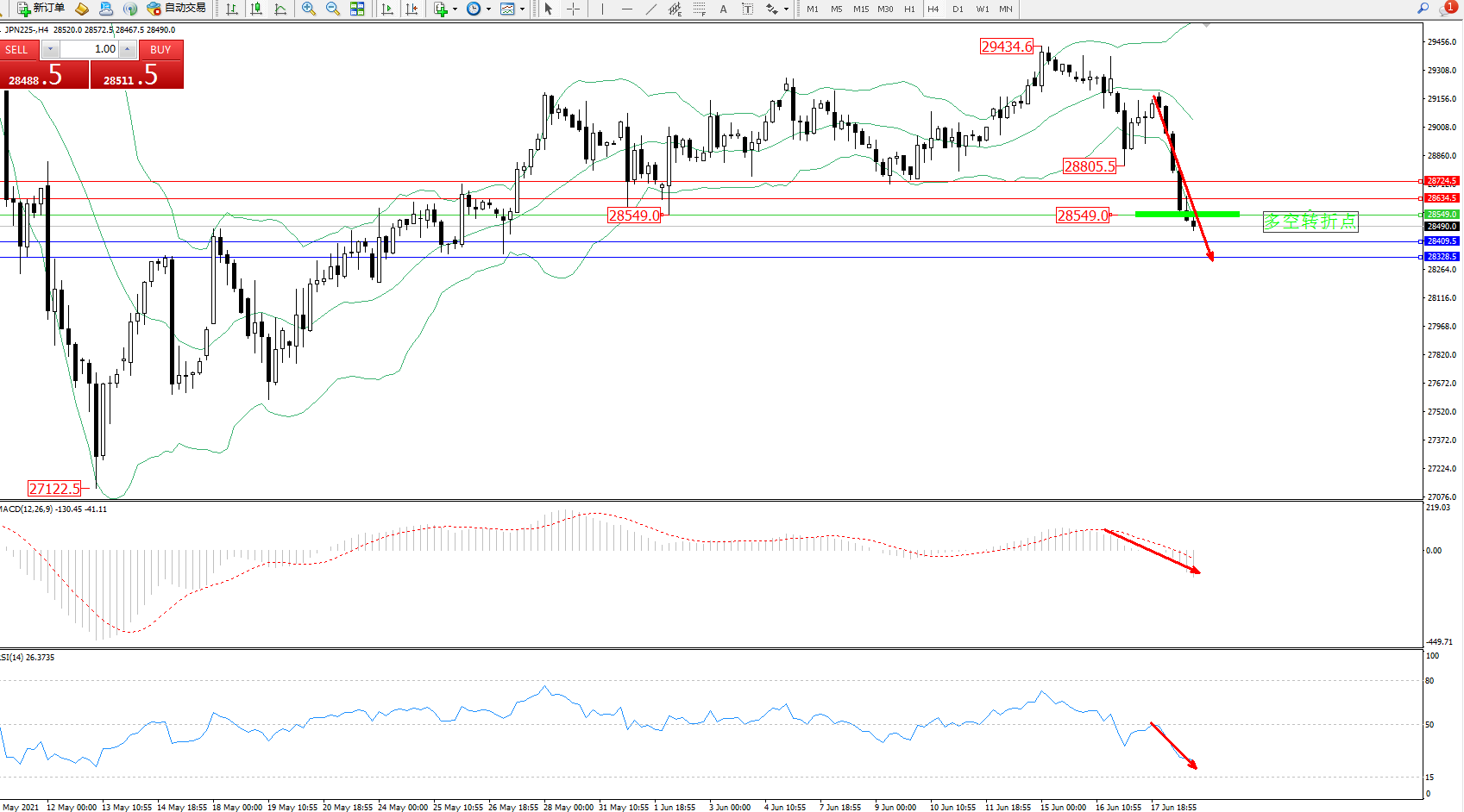 日经指数JPN225——4小时K线图显示: