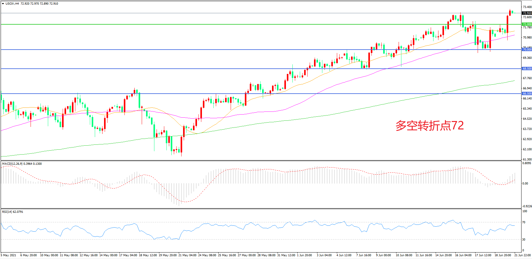 4小时图看,油价长阳拉升,强势突破72美元阻力,短期表现强势,均线系统成为下方支撑,MACD红柱增加,RSI指标走平,日内震荡上行概率较大。