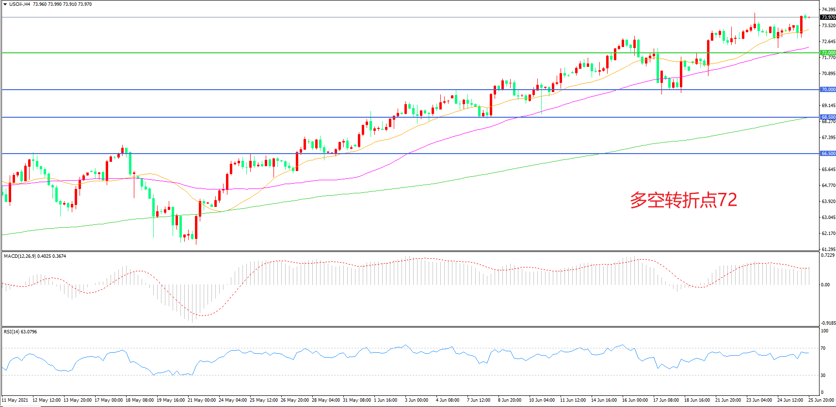 4小时图看,油价突破72美元阻力后再度上行,短期表现强势,均线系统成为下方支撑,MACD红柱增加,RSI指标走平,日内震荡上行概率较大。