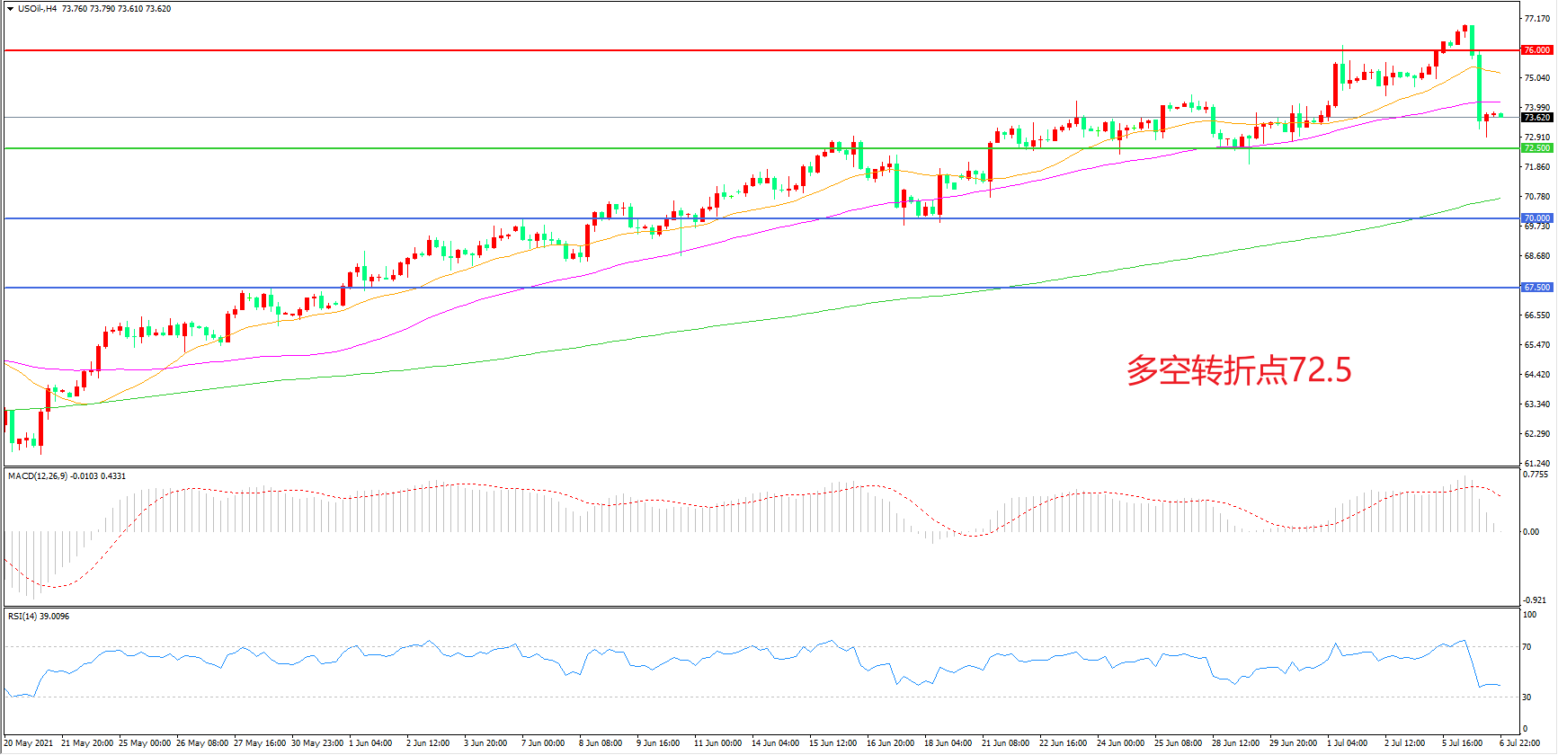 交易策略:在72.50之上看涨,目标75.00 78.00