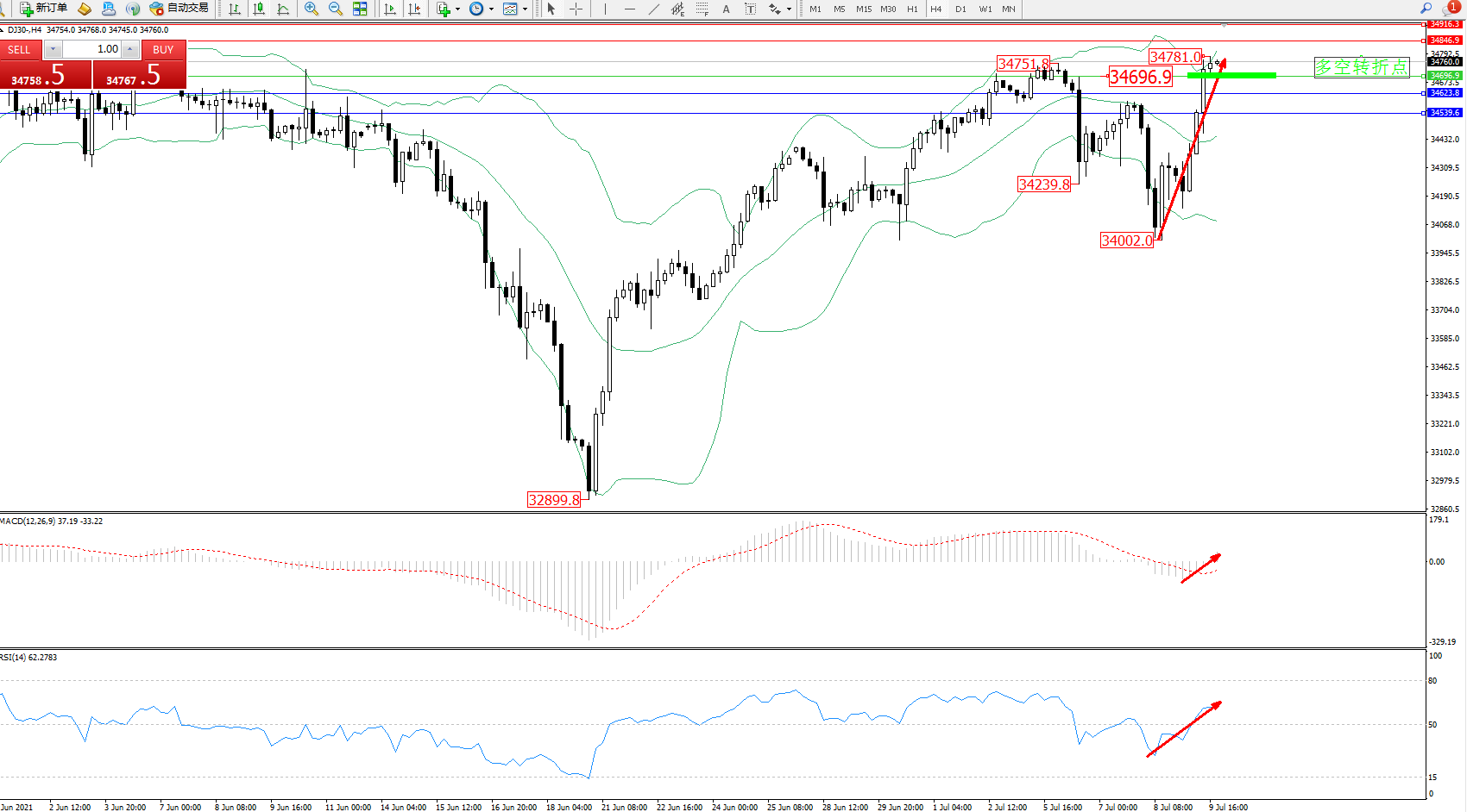 道琼斯指数DJ30——4小时K线图显示:
